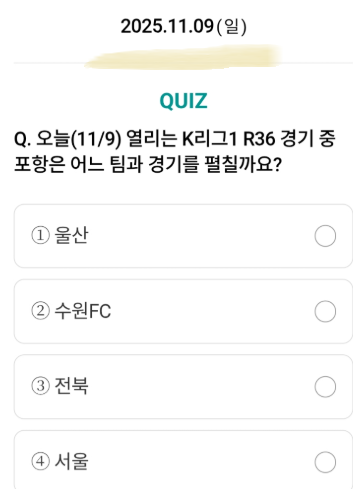 오늘(11/9) 열리는 K리그1 R36 경기 중 포항은 어느 팀과 경기를 펼칠까요?