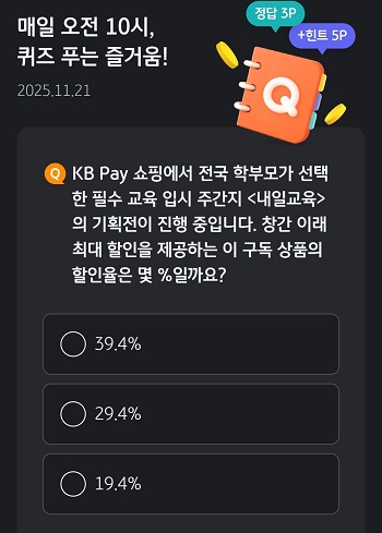 -KB페이 오늘의 퀴즈 오전 10시, 맞히면 10P