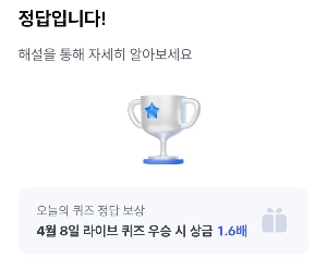 -오늘의 퀴즈 정답을 맞히면, 다가오는 라이브 퀴즈 우승 시 지급되는 상금의 '오늘의 퀴즈 정답 문제 수 x 10%'만큼 더 맏을 수 있어요.
