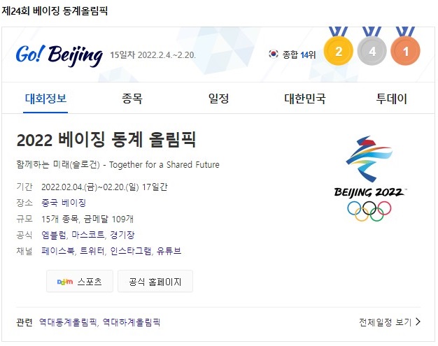 | 2022년 베이징 동계올림픽 한국 경기 일정 (0) | 2022.02.08 |