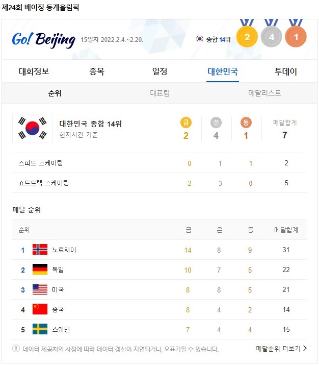 현재 대한민국 종합 순위는 금메달 2, 은메달 4, 동메달 1개로 14위 이고,